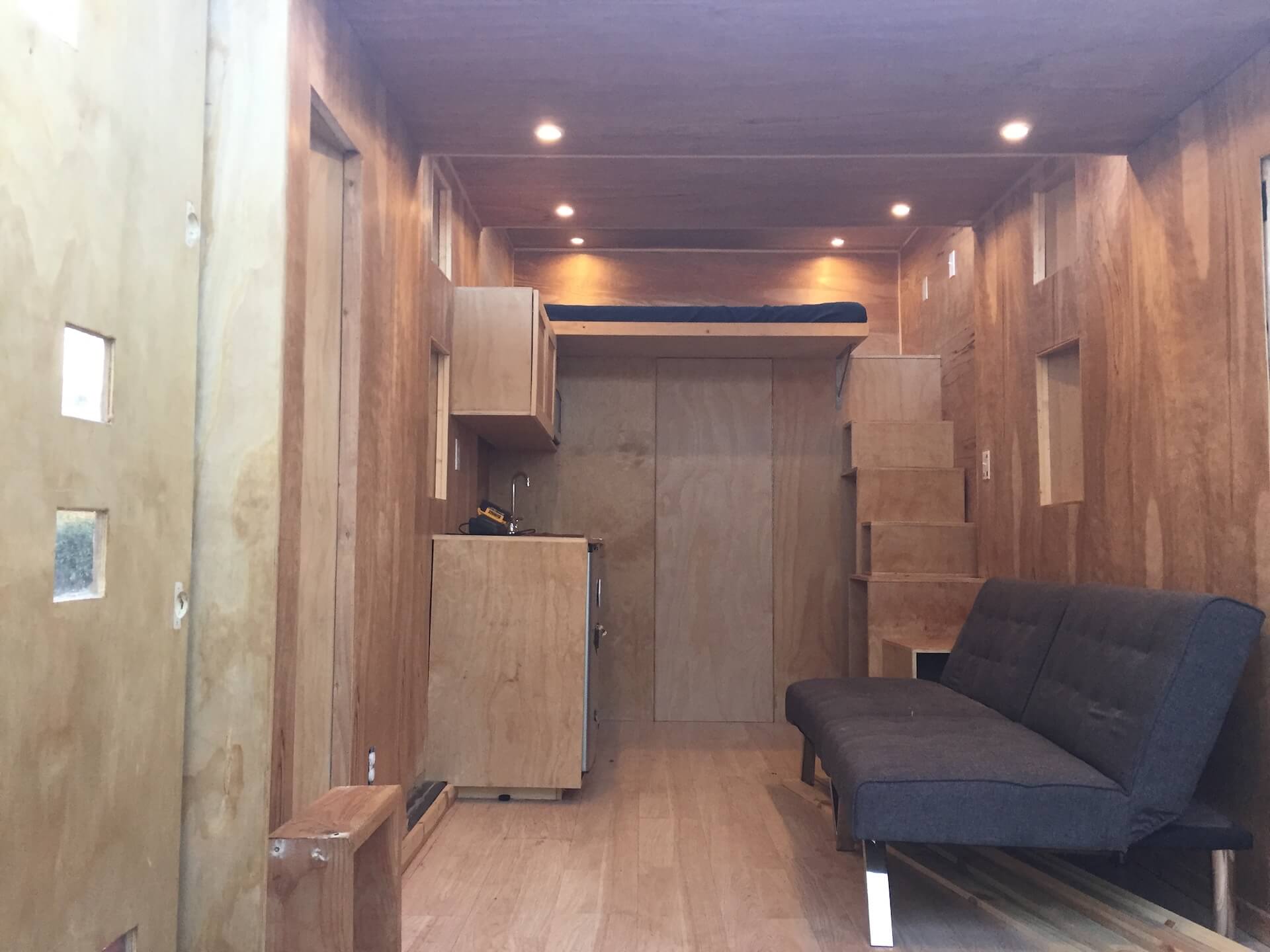 This is a 20-foot tiny home trailer that is a perfect getaway home on wheels. It features a set of custom built french doors which open up to a naturally lit space that has everything you need from a home like this: counter space, room for storage, a mini-fridge and microwave, and a full size bed right next to a wet room. The unit also features a Mirage A/C unit, a 3-tank water system with a dual flush toilet, and wall insulation rated at R-13.5, with the ceiling and floor at R-20. It sits on a diamond plate trailer and the frame for the unit is made from 2” steel square bars for optimal studiness. Both stable and sleek, this unit has a refined modern look with PVC panels on the outside accompanied by LED light strips that will be placed in the recesses of the exterior and interior to elevate the Evolution unit even further. Check out a virtual tour of the unit at this URL: https://youtu.be/i5un4jpNZJI