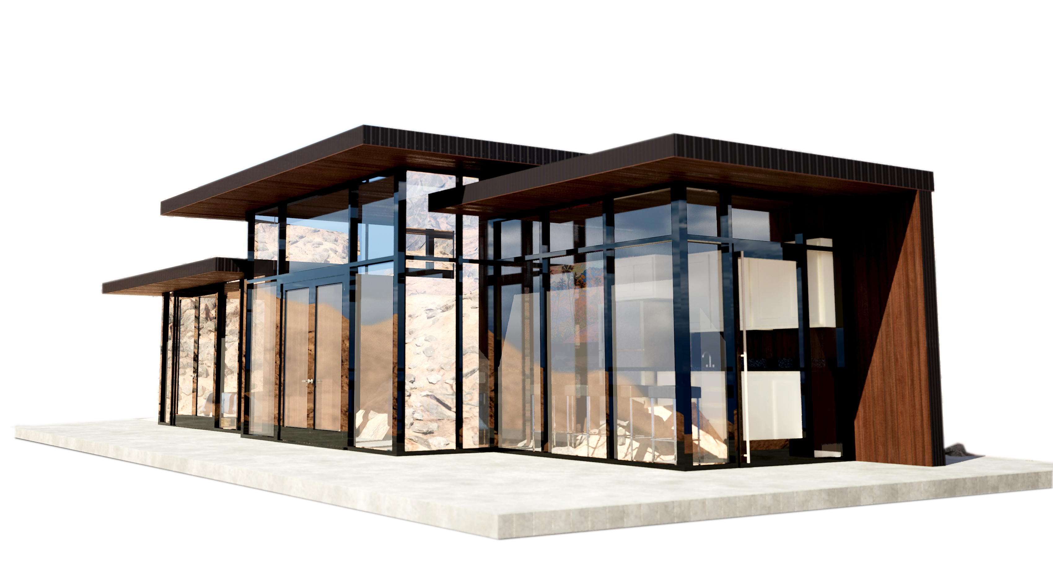 The Vista Lodge tiny home embodies biophilic design with its spectacular floor-to-ceiling glass walls that dissolve boundaries between interior and exterior. This architectural marvel features a distinctive split-level roof system that creates an elegant floating effect on its concrete foundation. The interior showcases premium sustainable materials, including warm wood ceiling paneling and durable hardwood flooring that adds rich texture throughout the space. The open floor plan maximizes the compact footprint with a dedicated bedroom, full bathroom, and integrated kitchen that flows seamlessly into the living area. Every element serves dual purposes - from clerestory windows providing natural ventilation to strategic room dividers creating distinct zones without sacrificing openness. The Vista Lodge offers a perfect balance of contemporary design and functional living, creating a sophisticated sanctuary wherever you choose to place it.